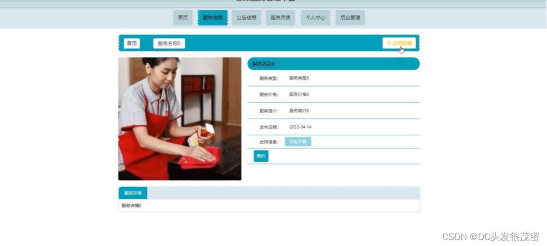 服务信息,在服务信息页面可以查看服务名称、 服务价格、服务简介、发布日期、合同信息等内容进行预约、详情或收藏等操作