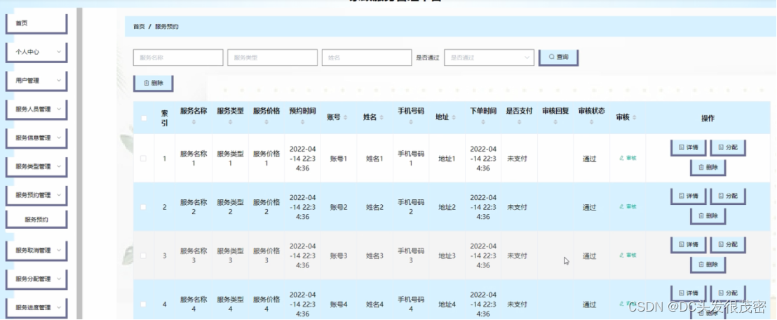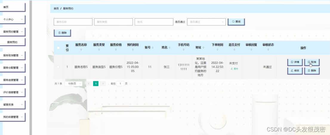 服务预约管理,在服务预约管理页面中可以对索引、服务名称、服务类型、服务价格、预约时间、账号、姓名、手机号码、地址、下单时间、是否支付、审核回复、审核状态等内容进行详情、取消、修改或删除等操作