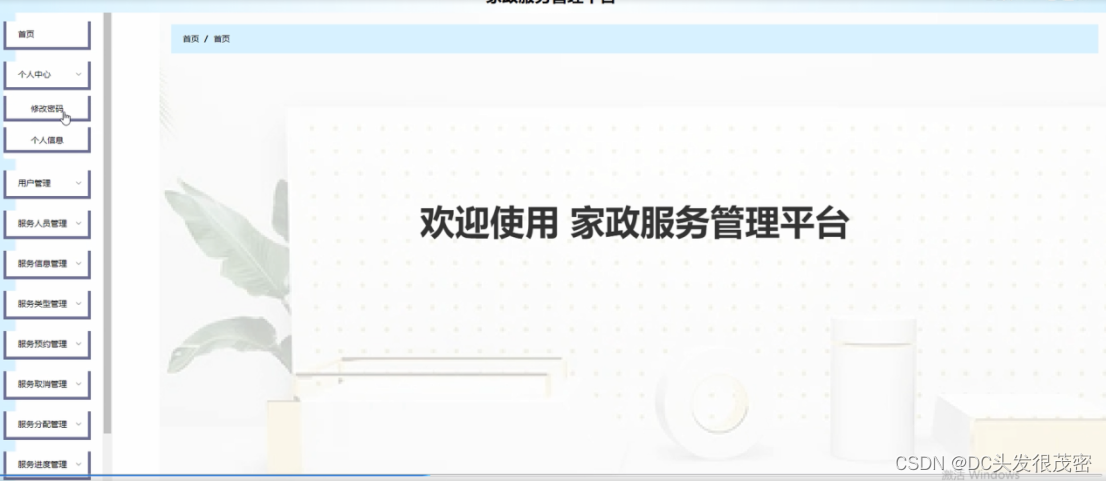管理员登录系统后,可以对首页、个人中心、用户管理、服务人员管理、服务信息管理、服务类型管理、服务预约管理、服务取消管理、服务分配管理、服务进度管理、评价信息管理、留言反馈、系统管理等功能进行相应的操作管理。