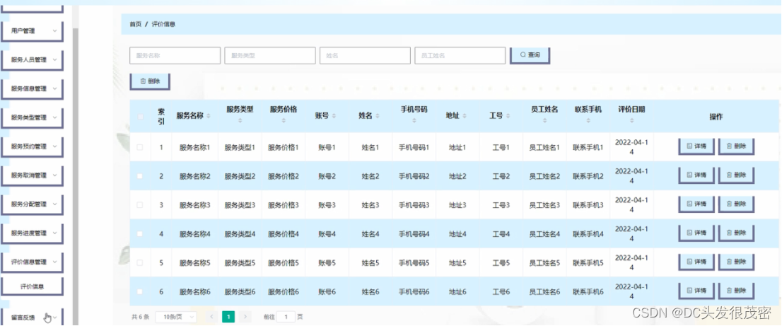 评价信息管理,在评价信息管理页面中可以对索引、服务名称、服务类型、服务价格、账号、姓名、手机号码、地址、工号、员工姓名、联系手机、联系手机、评价日期等内容进行详情或删除等操作