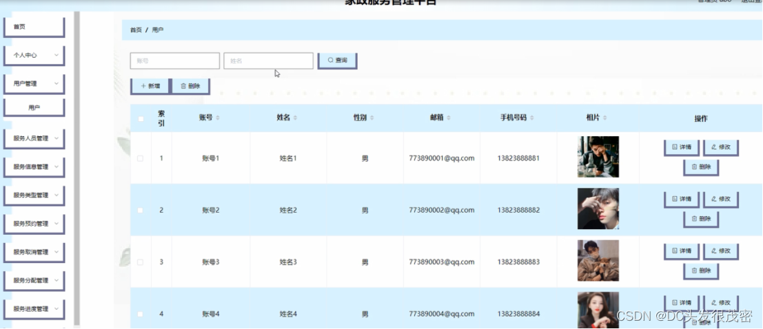 用户管理,在用户管理页面可以对索引、账号、姓名、性别、邮箱、手机号码、相片等内容进行详情、修改或删除等操作