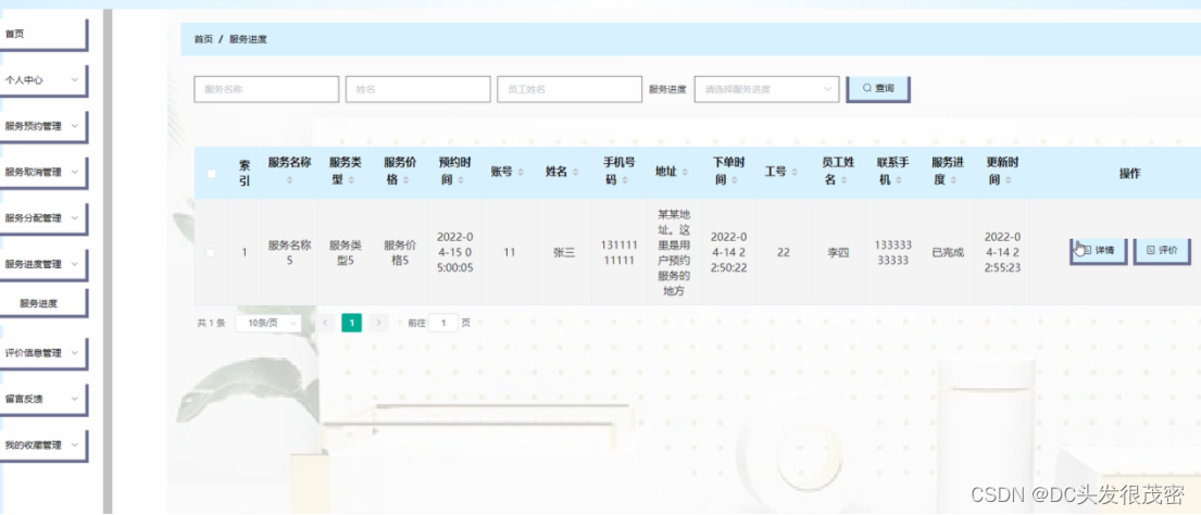 服务进度管理,在服务进度管理页面中可以对索引、服务名称、服务类型、服务价格、预约时间、账号、姓名、手机号码、地址、下单时间、工号、员工姓名、联系手机、服务进度、更新时间等内容进行详情或评价等操作。