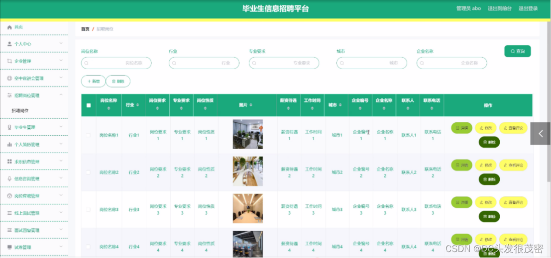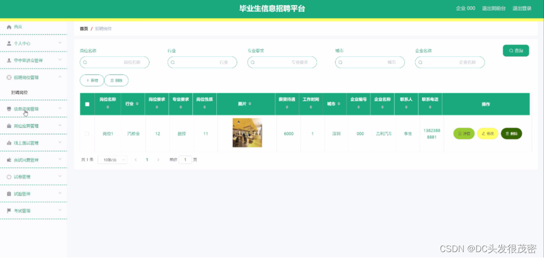 招聘岗位管理,在招聘岗位管理页面可以查看岗位名称、行业、岗位要求、专业要求、岗位性质、图片、薪资待遇、工作时间、城市、企业编号、企业名称、联系人、联系电话等内容,并可根据需要对招聘岗位管理进行详情、修改、删除等操作