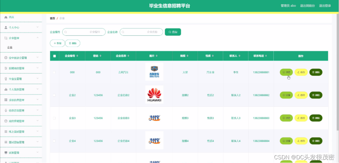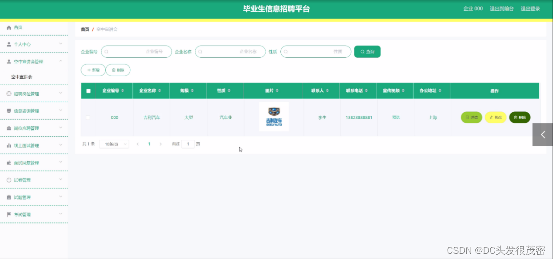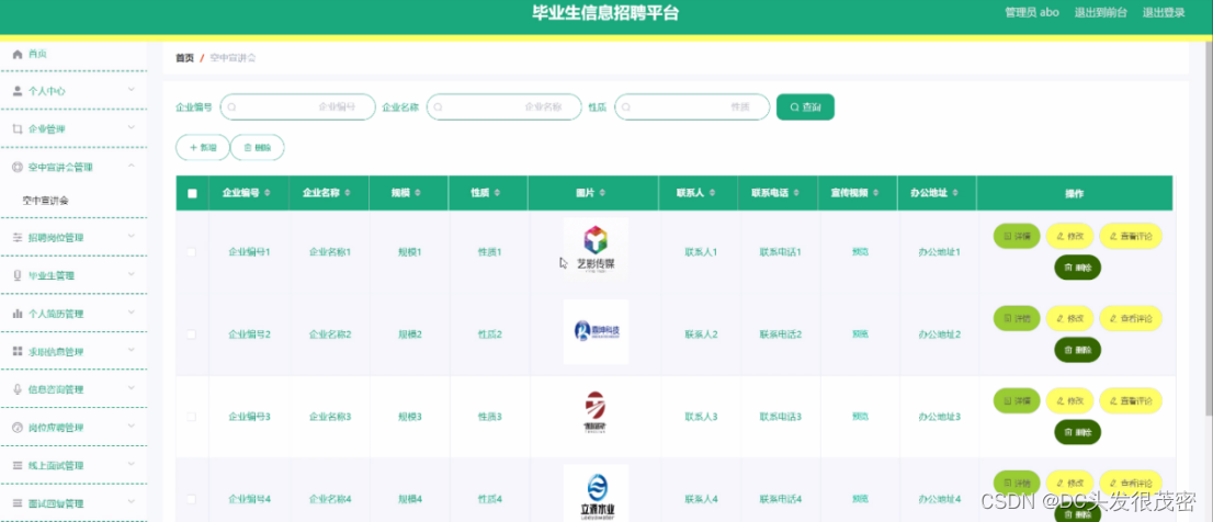 空中宣讲会管理,在空中宣讲会管理页面可以填写企业编号、企业名称、规模、性质、图片、联系人、联系电话、宣传视频、办公地址等内容,并可根据需要对空中宣讲会管理详细内容进行详情、修改、删除操作