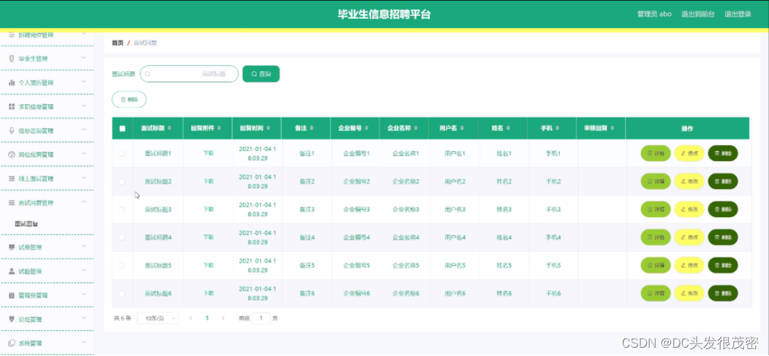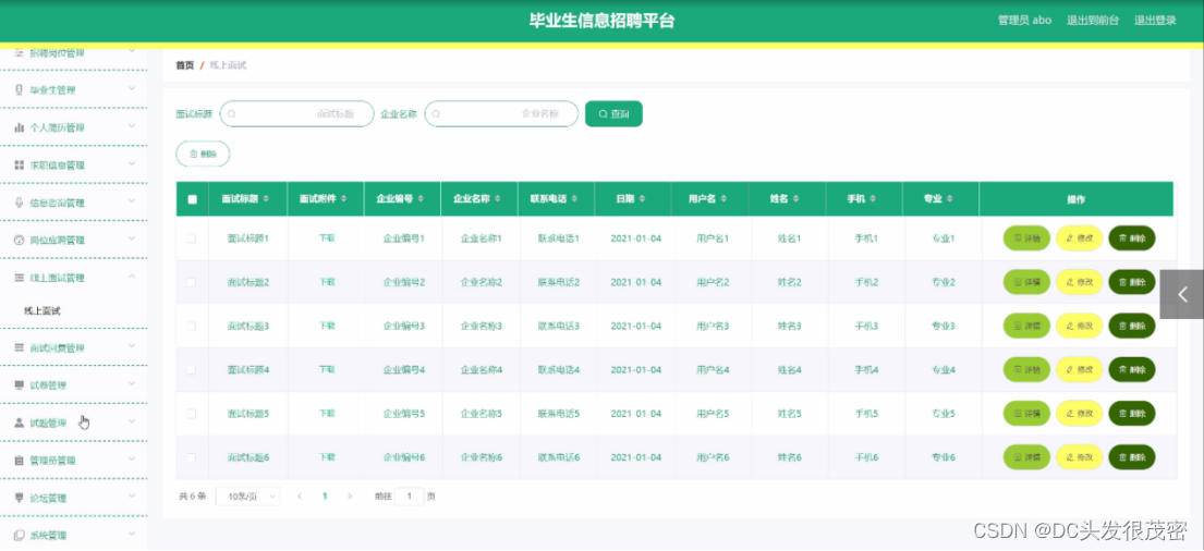 线上面试管理 ,在线上面试管理页面可以查看面试标题、面试附件、企业编号、企业名称、联系电话、日期、用户名、姓名、手机、专业等内容,并可根据需要对线上面试管理进行添加,修改,删除或详细内容等操作