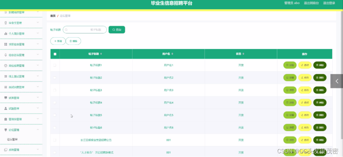 论坛管理 ,在论坛管理页面可以查看帖子标题、用户名、状态等内容,并可根据需要对论坛管理进行添加,修改,删除或详细内容等操作