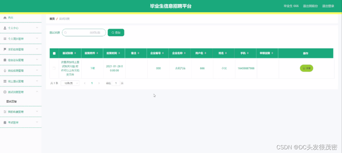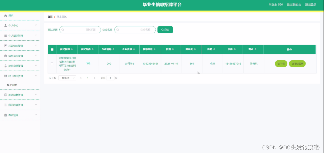 线上面试管理,在线上面试管理页面通过填写面试标题、面试附件、企业编号、企业名称、联系电话、日期、用户名、姓名、手机、专业等内容并可根据需要对线上面试管理进行详情、面试回复,
