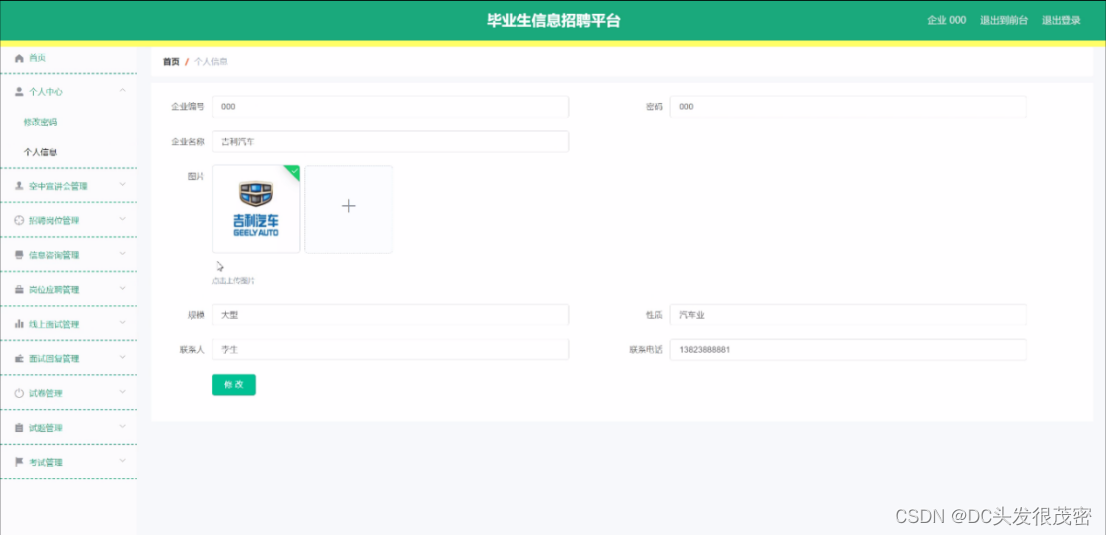 个人信息,在个人信息页面通过填写企业编号、密码、企业名称、图片、规模、性质、联系人、联系电话等内容并可根据需要对个人信息进行查看、修改