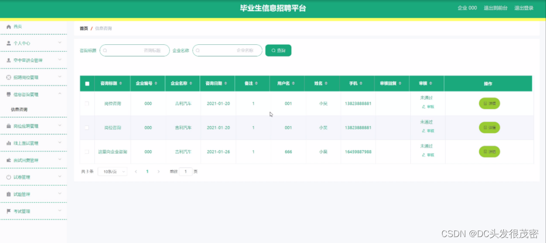 信息咨询管理 ,在信息咨询管理页面可以查看咨询标题、企业编号、企业名称、咨询日期、备注、用户名、姓名、手机、审核回复等内容,并可根据需要对信息咨询管理进行添加,修改,删除或详细内容等操作