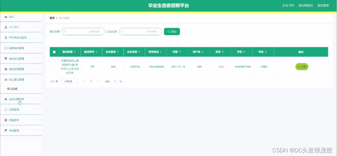 线上面试管理,在线上面试管理页面可以查看面试标题、面试附件、企业编号、企业名称、联系电话、日期、用户名、姓名、手机、专业等内容,并可根据需要对线上面试管理进行详情等操作