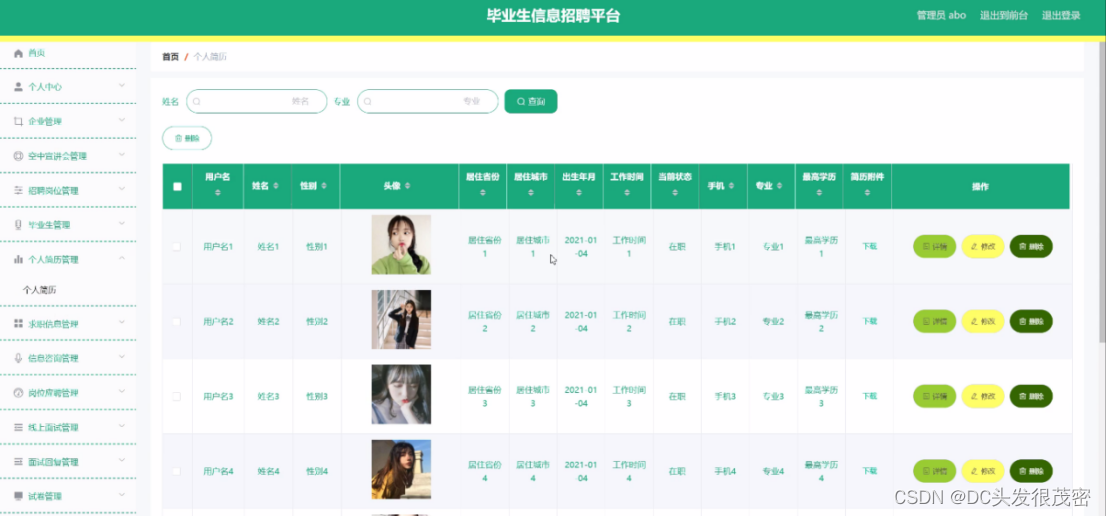 个人简历管理,在个人简历管理页面可以查看用户名、密码、姓名、性别、头像、居住省份、居住城市、出生年月、工作时间、当前状态、手机、专业、最高学历、简历附件等内容,并可根据需要对个人简历管理信息进行添加,修改,删除或详细内容等操作