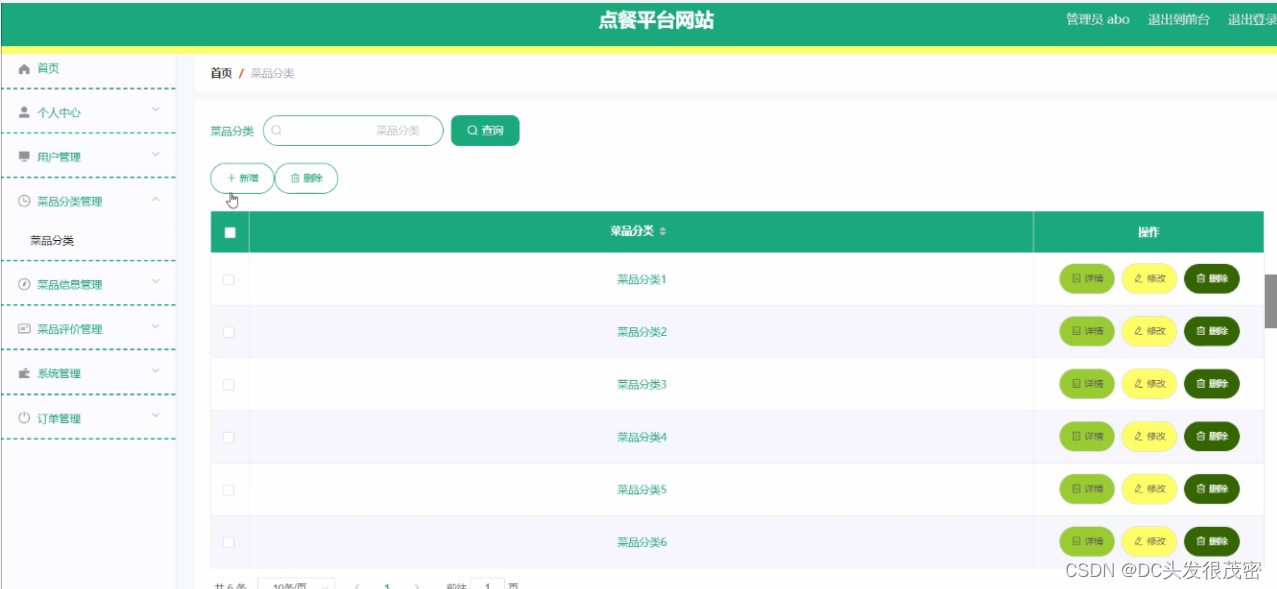 管理员对菜品分类管理查看菜品分类等信息进行详情、删除、修改操作。菜品分类管理效果图