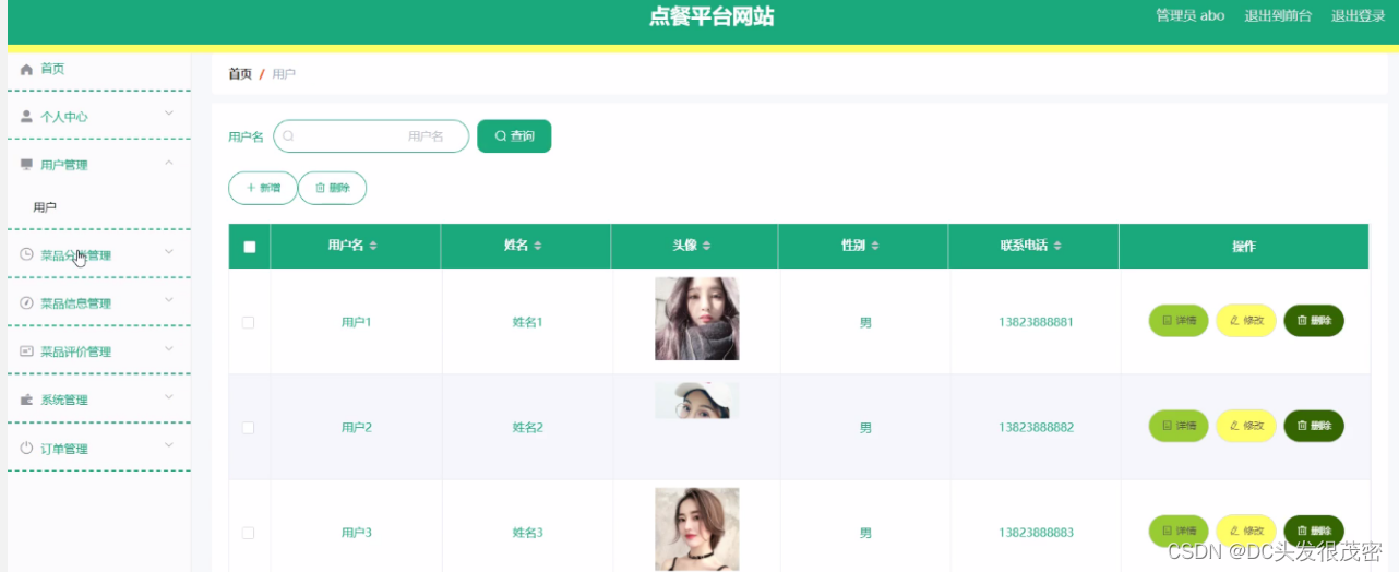 管理员对用户管理获取用户名、姓名、头像、性别、联系电话并进行详情、删除、修改。用户管理效果图