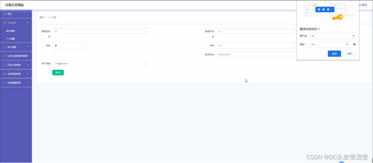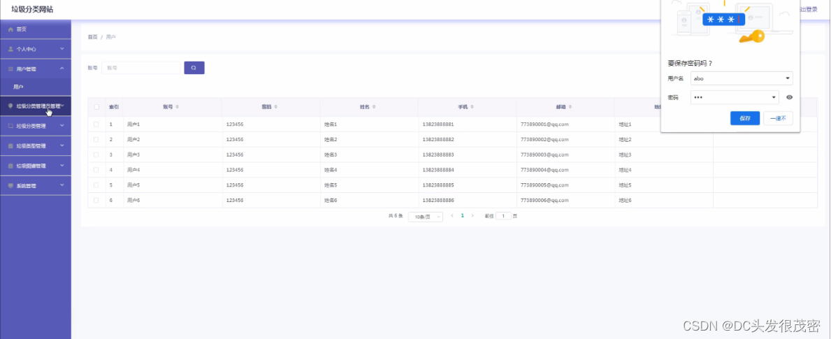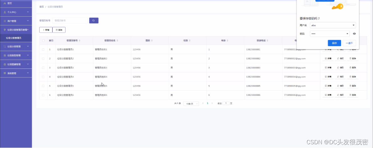 用户管理,在用户管理页面中可以通过填写账号、密码、姓名、手机、邮箱、地址等内容进行修改、删除,如图5-6所示。还可以根据需要对垃圾分类管理员管理进行详情,修改或删除等详细操作,如图5-7所示。
