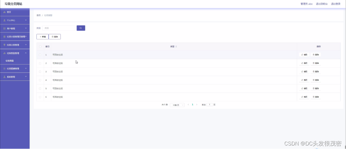 垃圾类型管理,在垃圾类型管理页面中可以填写类型等信息,并可根据需要对已有垃圾类型管理进行修改或删除等详细操作,如图5-9所示。
