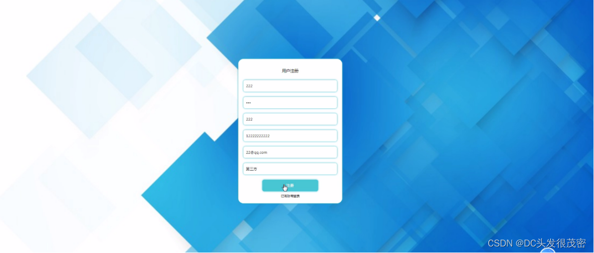 用户登录、用户注册,在用户注册页面可以填写账号、密码、姓名、手机、邮箱、地址等信息进行注册、登录,如图5-2所示。