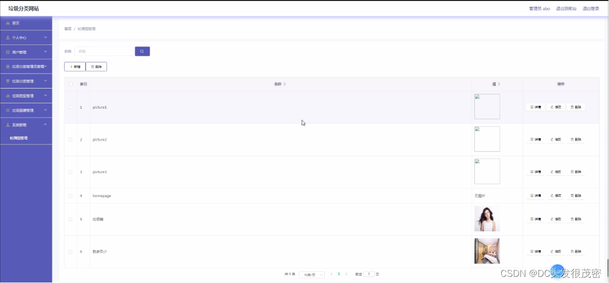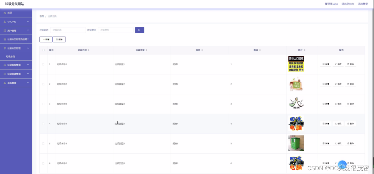 垃圾分类管理,在垃圾分类管理页面中可以填写垃圾名称、垃圾类型、规格、数量、图片等信息,并可根据需要对已有垃圾分类管理进行修改或删除等操作,如图5-8所示。