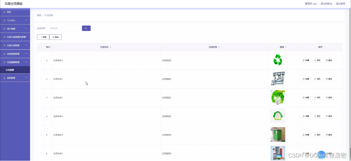 垃圾图谱管理,在垃圾图谱管理页面中可以查看垃圾名称、垃圾类型、图谱等内容,并且根据需要对已有垃圾图谱管理进行详情,修改或删除等详细操作,如图5-10所示。