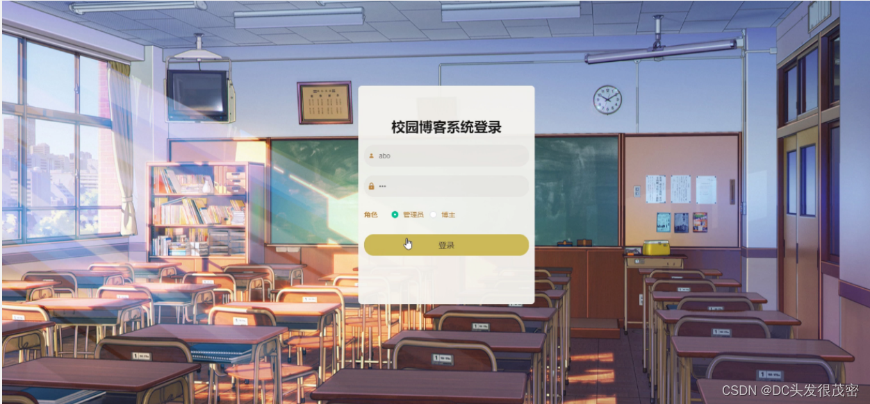 管理员登录,通过填写用户名、密码、角色等信息,输入完成后选择登录即可进入校园博客系统