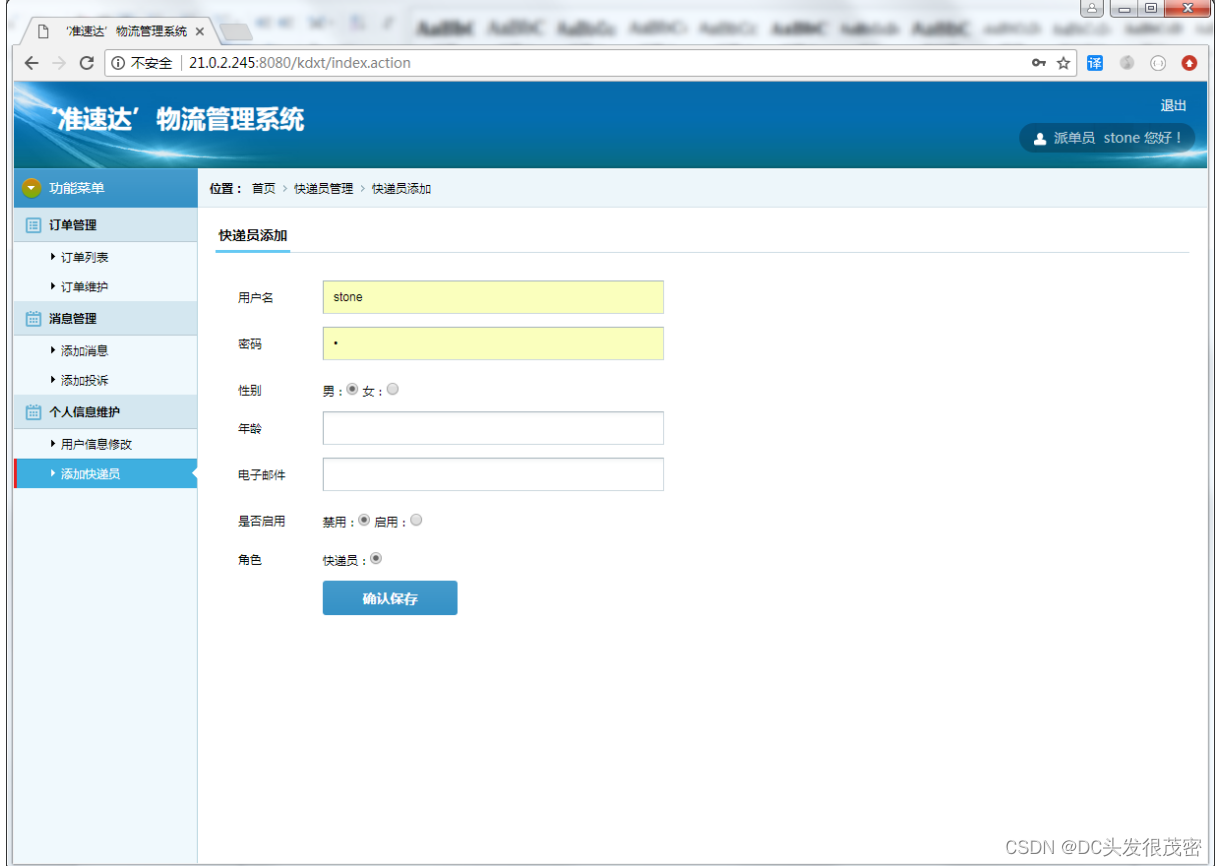 快递员添加:主要完成的工作是给系统添加快递员,完成订单的派送工作。