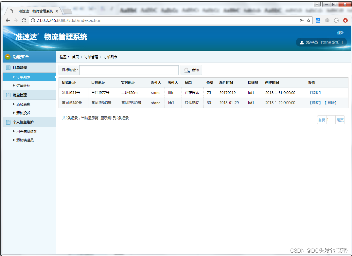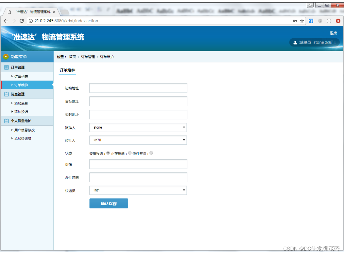 派单员界面:主要完成新增派单和派单员的指定,送货地址等关键信息的维护。