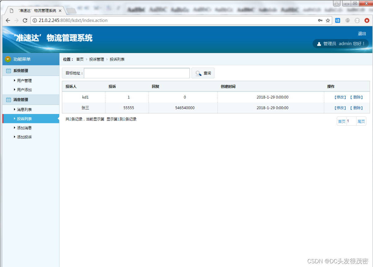 投诉界面主要完成的工作是把各个业务口的投诉信息汇总上来,其中包括快递员,派单员,客户等各个方法的投诉信息。