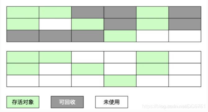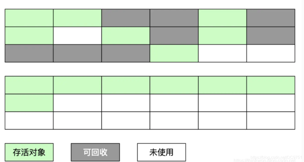 - 把内存划分为两个区域,每次只使用其中的一个区域;垃圾回收时,将当前区域的存活对象都复制到另外一个区域中,然后清空本区域。