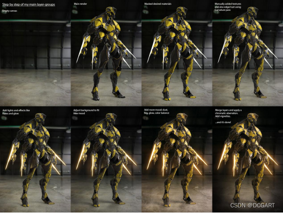 拆分的三维模型在通过各种微调、细节优化后,便开始了贴图的绘制,这也是游戏美术风格、角色美术细节体现的部分。