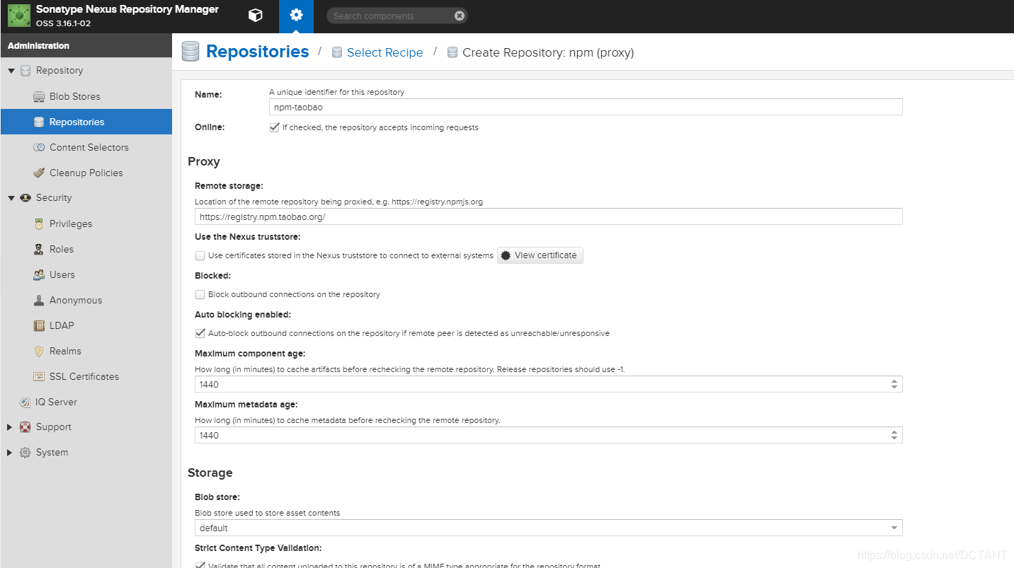 新建一个Repository,类型为npm(proxy)