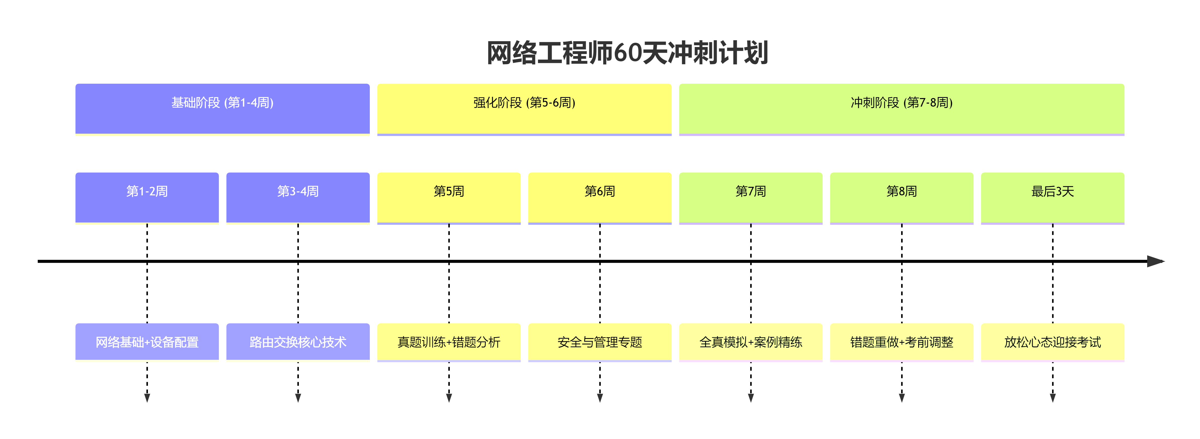 网络工程师是软考中级里相对容易通过的科目,零基础两个月时间完全足够!关键是现在就开始行动,跟着计划一步一步来。