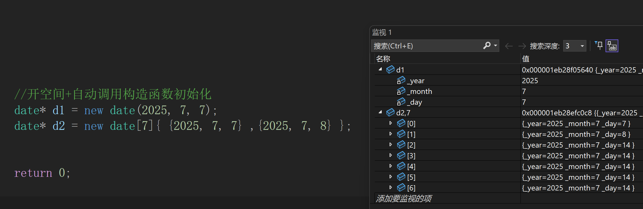 - 调用operator new[]函数,在operator new[]中实际调用operator new函数完成N个对象空间的申请