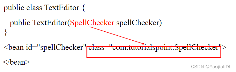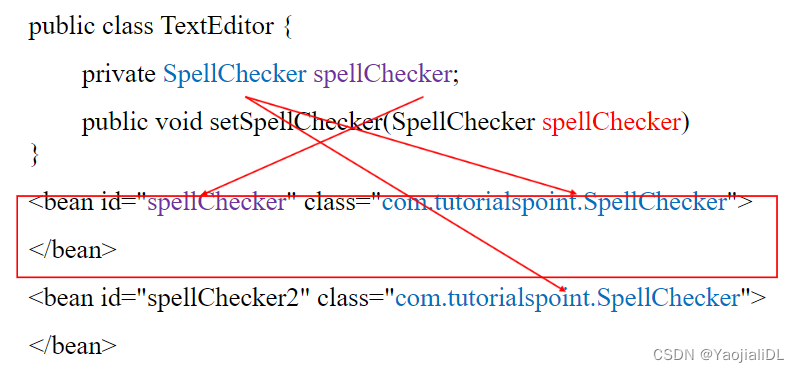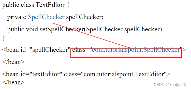TextEditor依赖SpellChecker类,在Spring 中可以看作一个Bean中包含另外的Bean。