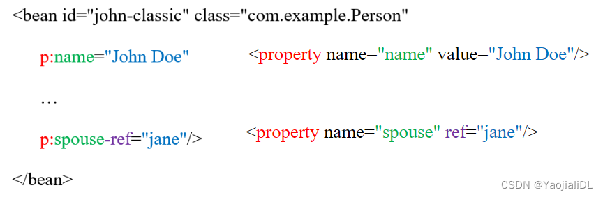 p-namespace将原先的<property>子元素的设置改成<bean>元素属性的设置。