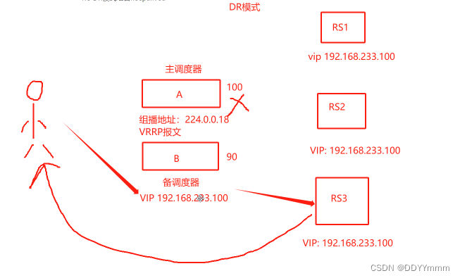 主调度器能够正常运行时,由主调度器进行后端真实服务器的分配处理,其余的备用调度器处在冗余状态。