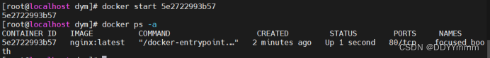 格式:docker start 容器的ID/名称