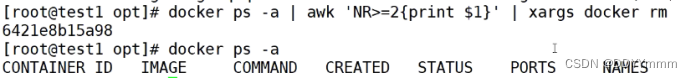 docker ps -a | awk 'NR>=2{print $1}'| xargs docker rm