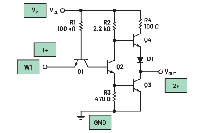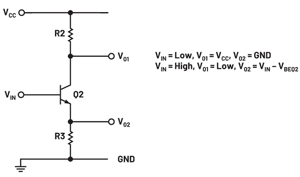 图1中的第二级晶体管Q2使用分相器来驱动上拉和下拉输出级的两半。它允许以相反相位产生输入条件,从而可以反相驱动输出晶体管。这样,Q4关断时Q3可以导通,反之亦然,如图3所示。