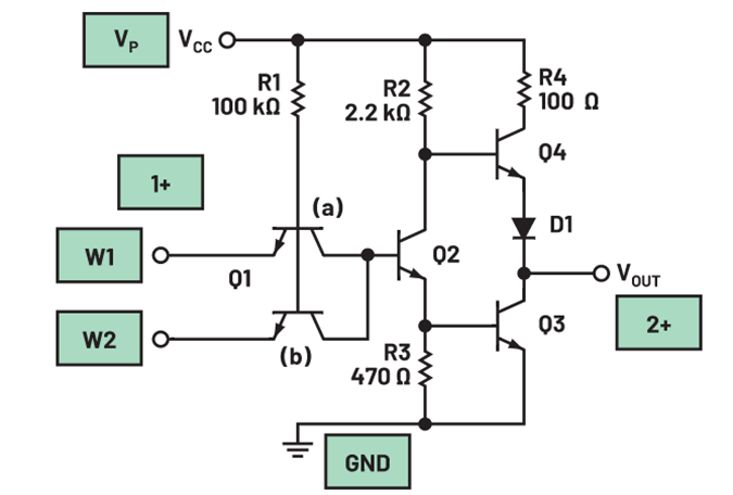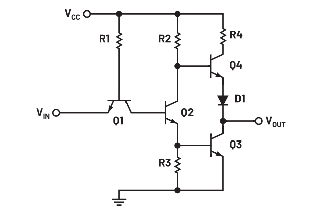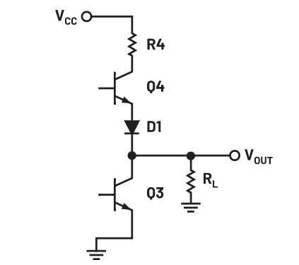 输出晶体管对Q3和Q4与二极管D1一起被称为图腾柱输出,如图4所示。这种输出配置提供了主动拉电流或灌电流的能力,对于驱动容性负载很有用。电阻R4用于限制VCC提供的电流。在稳态条件下,一次只有一个晶体管导通。