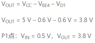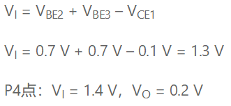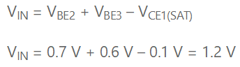 随着输入电压进一步增加,Q2传导更多电流,从而完全导通。Q2的基极电流由Q1的基极-集电极结(现在是正向偏置)提供,Q1仍处于饱和状态。最终,Q3达到导通点。这发生在: