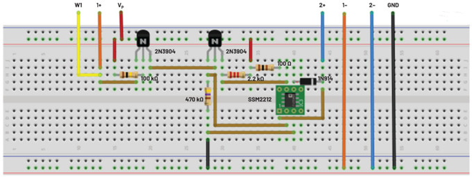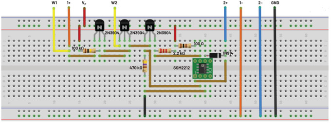 ADALP2000 模拟部件套件随附五个2N3904 NPN晶体管。较旧的套件可能包含一对匹配的SSM2212。所示的建议试验板布局是针对SSM2212连接。如果只使用2N3904器件,请根据需要更改布局。