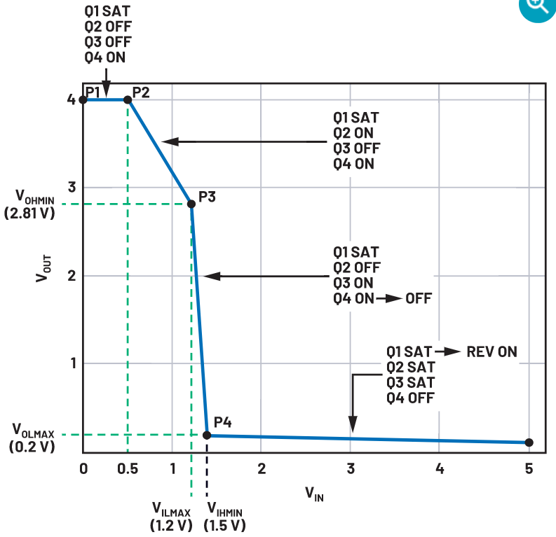 通过施加缓慢上升的输入电压,并确定相对于每个晶体管的导通状态变化而发生的事件序列以及这些变化发生的临界点,可以推导出TTL逆变器的传输特性。考虑图11所示的电路输入与输出传输特性曲线。