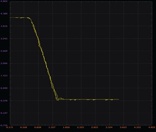 将波形发生器W1配置为具有0 V偏移和6 V幅度峰峰值的100 Hz三角波。在x-y模式下使用示波器观察电路的电压传输曲线。