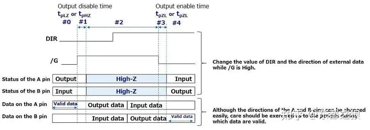 我们来看一下图3这个系统的逻辑情况,通过在/G为高电平时更改DIR的值,可以轻松更改A和B引脚的方向。/G为高电平时,更改DIR的值和外部数据的方向。在周期#0,数据从B传输到A。在周期#1,A引脚处于高Z状态。因此,输出数据无效。在周期#2,更改DIR的值和外部数据的方向。在周期#3,启用A和B引脚。然后,输出数据在周期#4开始时保持稳定。在周期#4,数据从A传输到B。详细输入和输出逻辑关系如图4所示。