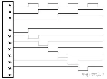 解码器也是一种典型的组合逻辑电路,我们以VHC138为例进行逻辑解读。解码器将N个编码输入的二进制信息转换为最多2N个独特输出。它通常用于增加端口数量和生成芯片选择信号。图6显示了3对8解码器(即具有三个输入和八个输出的解码器)的逻辑符号、真值表和时序图。