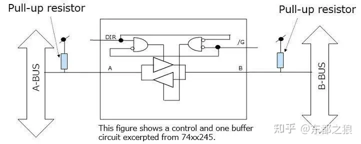 双向总线缓冲器(收发器),比如74VHC245。双向总线缓冲器(收发器)是一种其I/O引脚可配置为输入和输出以接收和发送数据的逻辑电路。由于收发器允许通过控制信号(DIR)更改信号方向,所以它沿着总线传输,双向传输数据。图3显示了收发器的应用示例。双向使用总线信号时,将总线输入和总线输出都通过上拉电阻连接到VCC或GND,以防止在控制信号(DIR)切换信号时输入信号变为开路(未定义)。切换信号时请注意不要将输出与总线输出短路。