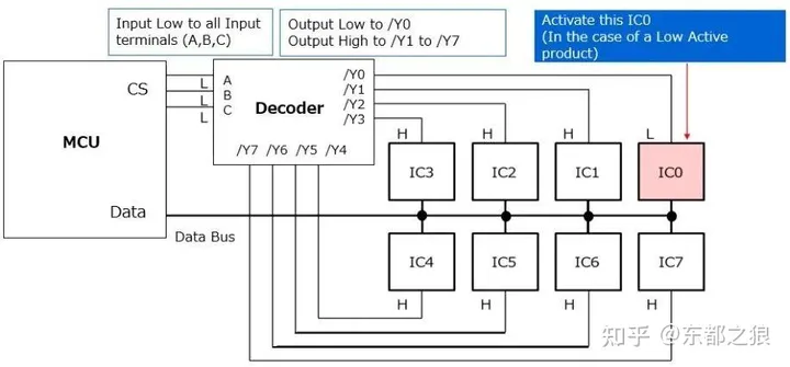 图7则显示如何使用3对8解码器从三个输入(A、B和C)生成八个芯片选择信号。当A、B和C都为低电平时,只有/Y0输出提供逻辑低电平,所以选择IC0。图7表明,通过三个输入的组合,可以从最多八个芯片中选择任意芯片。超10万种现货元器件,一件也发货,来唯样商城购正品~