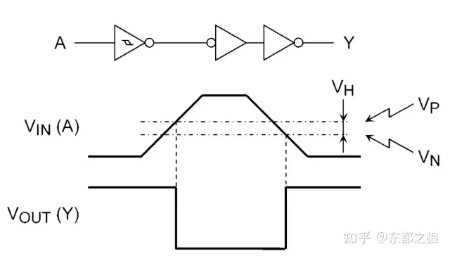 我们再看一个特别的示例,施密特触发装置(以VHC14为例)。施密特触发装置在两个输入阈值电压之间有一个磁滞带。图5显示了具有输入阈值滞后的施密特反相器的输入和输出波形。对于具有磁滞的IC,正向阈值电压(VP)不同于负向阈值电压(VN)。对于缓慢上升或下降的输入,输入阈值滞后(VH)有助于稳定输出。即使存在输入噪声或电源或噪声引起的接地反弹的情况下,IC也不会产生错误输出,除非噪声或反弹超过磁滞宽度。
