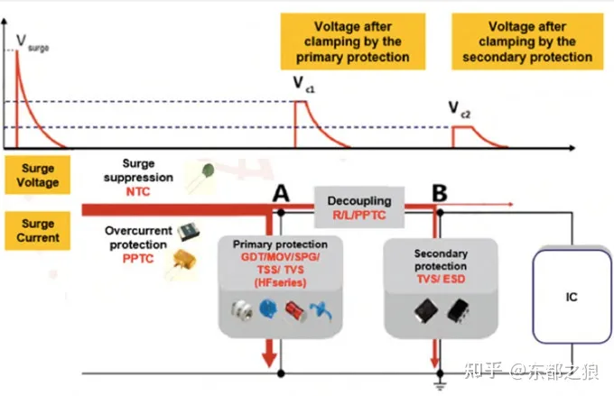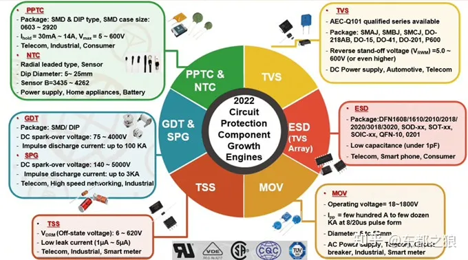 如果再细分,电路保护可以根据浪涌能量的大小、响应速度、受保护接口的数据传输速率等要求,划分出不同的应用场景,而不同场景需要有不同的保护元件来“驻守”,才能达到可靠性和安规设计的要求。有时,还需要多个保护元件配合使用,才能构筑一个完整的电路保护“防线”。