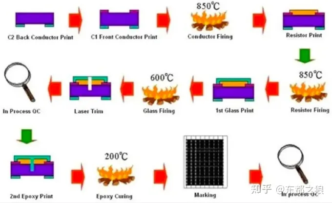 按照产品特性、材料和工艺,片式电阻可分为厚膜电阻和薄膜电阻两类。前者基于金属钌系电阻浆料,通过印刷、烧结、调阻等工艺制造而成,在成本和抗湿性能上比较有优势;后者是采用真空蒸发、磁控溅射等工艺将电阻材料蒸镀于陶瓷等绝缘材料基板表面而制成,精度比较高。