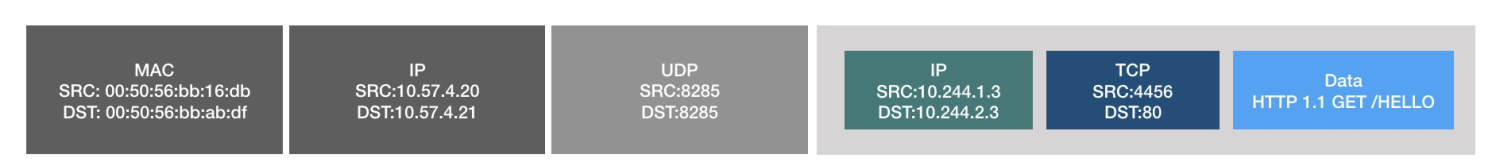 - flanneld查看数据包的IP头,发现目的地是10.244.2.3,于是从自己的路由中找去这个目的地下一跳,从kube-flannel传来的信息指示10.244.2.0/24这个子网在主机10.57.4.21上(这一步已经在kube-flannel和flanneld进程启动后就立刻完成了),于是flanneld进程经过一些必要的处理后,把从tun0来的数据包(包括TCP头、IP头)当成数据,通过打开的udp端口发往了10.57.4.21的UDP8285端口。